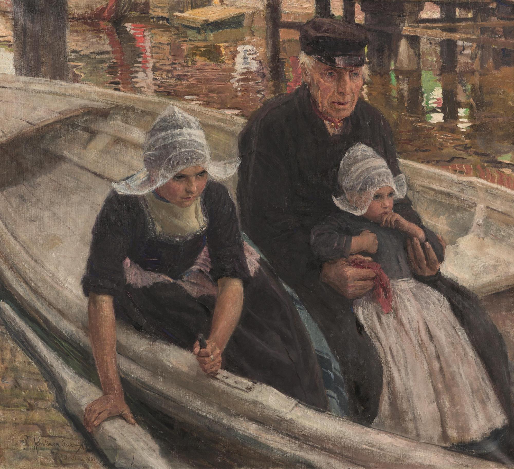 Ein alter weißhaariger Fischer mit Schirmmütze sitzt in einem Ruderboot, zwischen seinen Knien hält er ein kleines Mädchen in holländischer Tracht und einer weißen Haube mit flügelartig ausgestellten Seitenteilen. Links neben dem Fischer sitzt ein älteres Mädchen, ebenfalls in Tracht, die das Boot zur Kaiufermauer heranzieht. Ihr Blick ist ernst und konzentriert nach vorne gerichtet. Im Hintergrund ist das spiegelnde Wasser des Kanals sowie Kaianlagen aus Holz sichtbar.