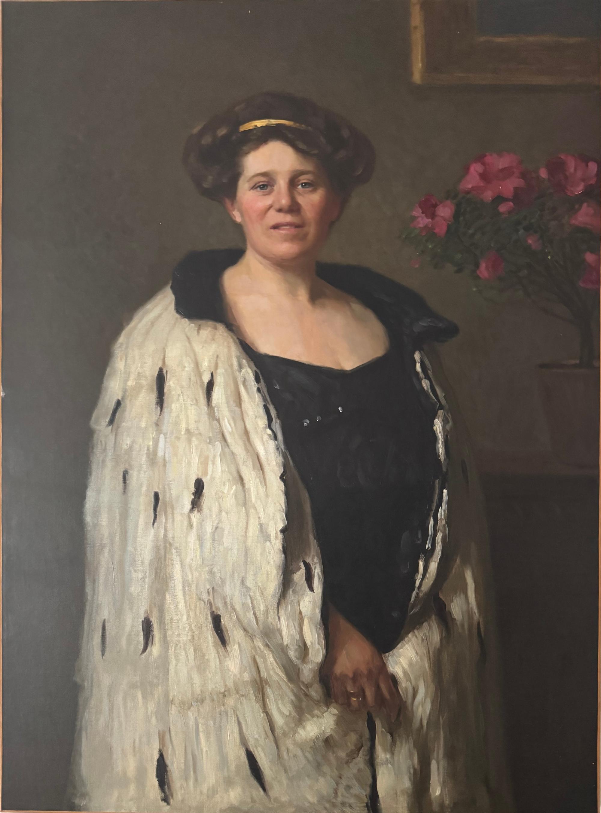 ¾ Portrait stehend, in leichter Schrägansicht, das Haupt und den Blick auf den Betrachter gerichtet. Die Dargestellte trägt ein weit ausgeschnittenes schwarzes Kleid und darüber einen Hermelinumhang mit schwarzem Pelzkragen, den die Dargestellte mit den Händen vor dem Körper zusammenrafft. Die hochgesteckten schwarzen Haare der Dargestellten werden von einem goldenen Haarreif geziert; an ihrem rechten Ringfinger trägt sie einen goldenen Ring. Im Hintergrund ist eine Kommode, darauf ein Blumenstock mit altrosa Blüten und darueber teilweise ein Bild im Goldrahmen sichtbar.